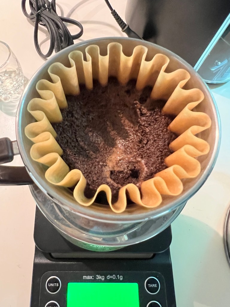 注水的水溫約85~88度C,先悶蒸再以繞圈的方式慢慢注水入咖啡粉裡。