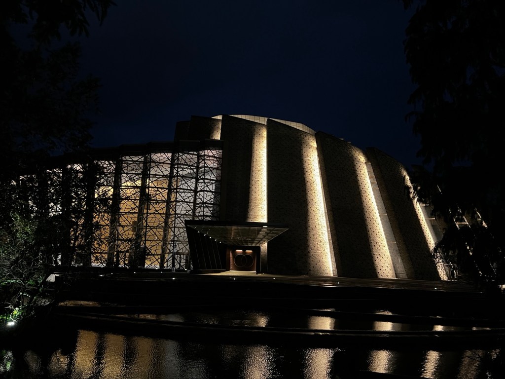 夜晚劇院的燈光透過窗花,倒映於水面上,相當迷人。
