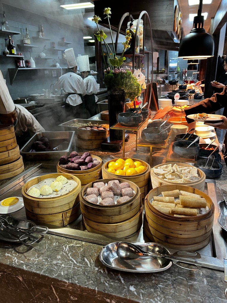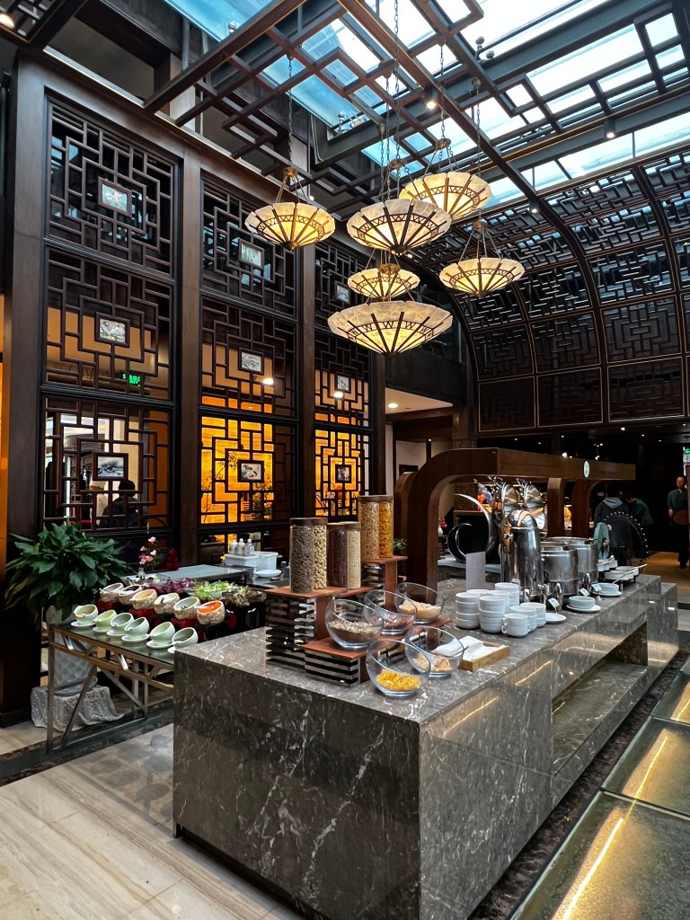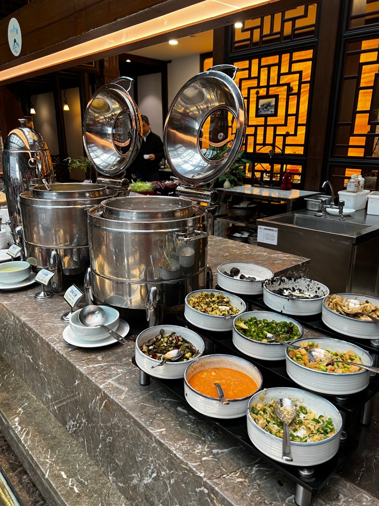 來到枕水酒店的餐廳,中式裝潢氣派典雅,大片落地窗可欣賞外面的小橋流水,食物種類相當多樣且充足,讓人吃得心滿意足。
