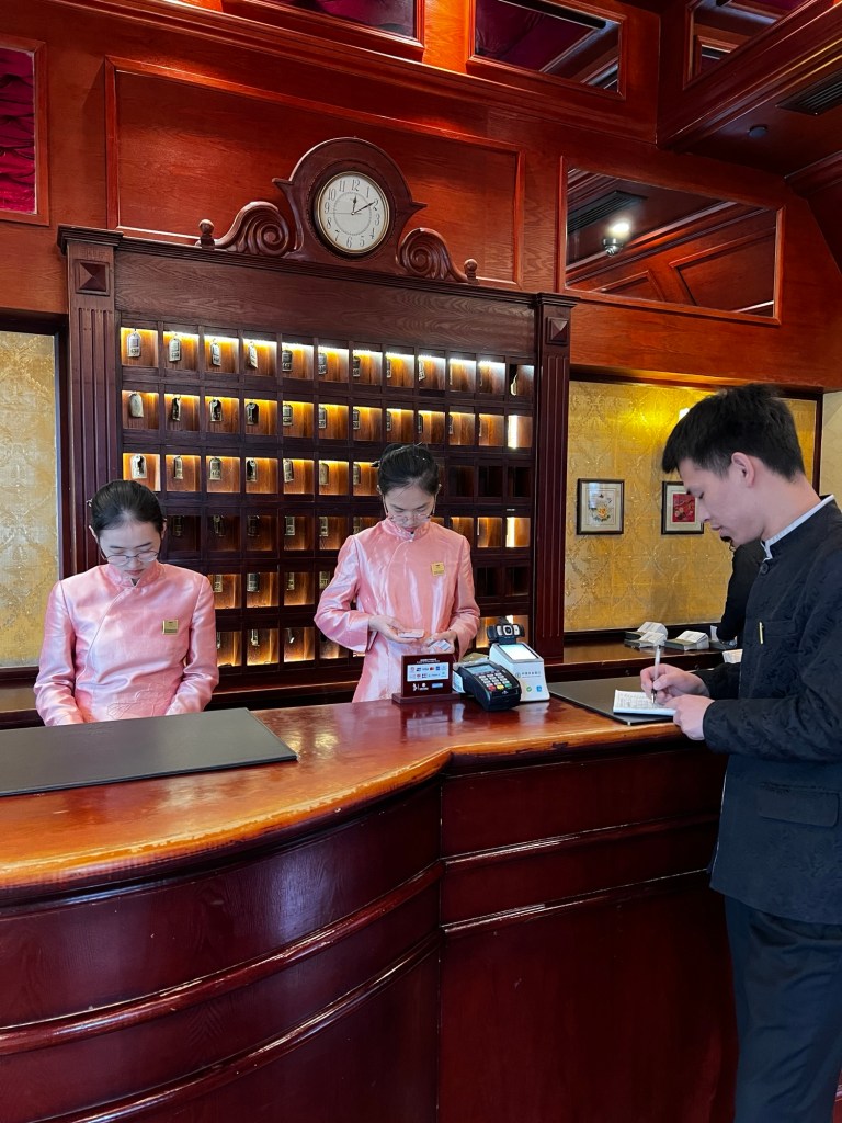 在酒店正門外看不出屋子裡面的樣子,但一入門就可以看到大廳的富麗堂皇。我發現櫃檯小姐姐說話都很溫柔,很軟,甚至讓我都聽不太清楚她們講什麼。