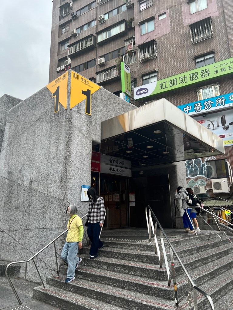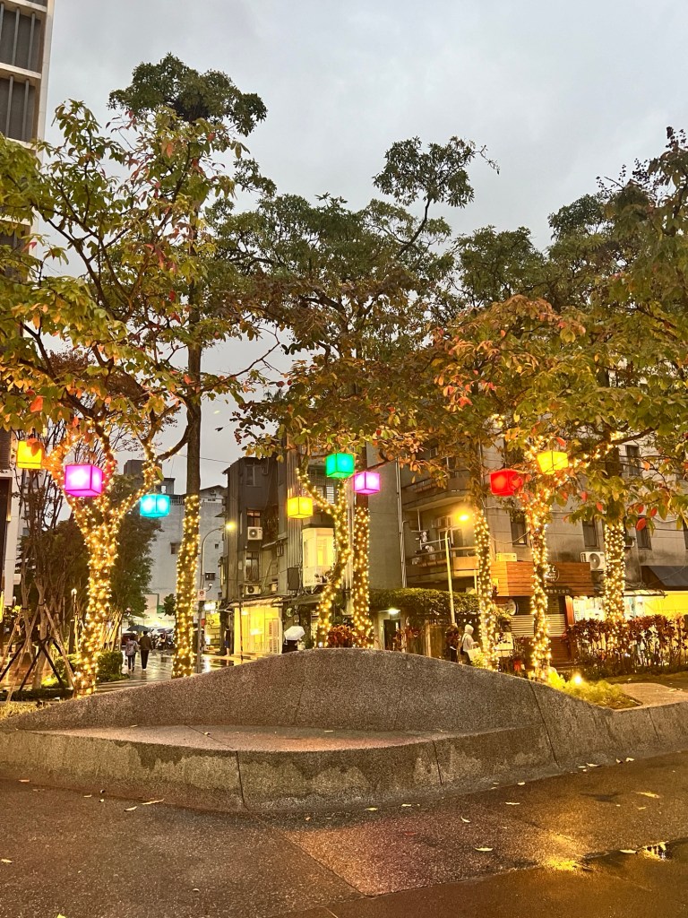 我走去捷運中山站搭車,這時店家和公園都點起了燈,伴著毛毛細雨,這街區變得更有氛圍感了。