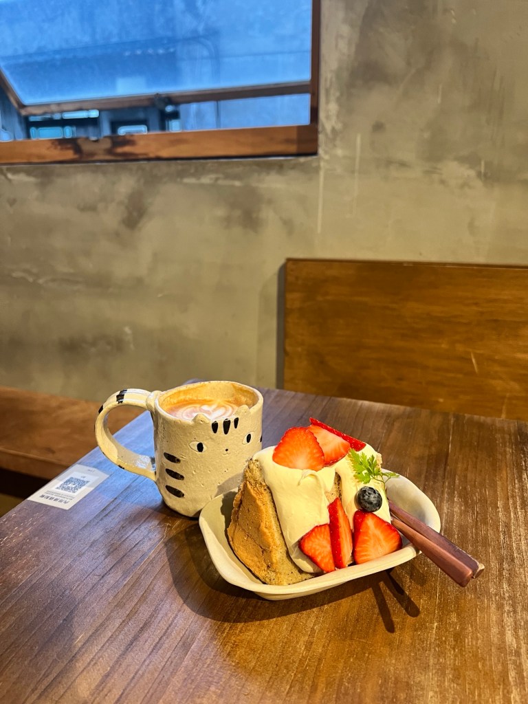 我點了一杯拿鐵跟紅茶口味的草莓戚風蛋糕。拿鐵雖然沒有特別驚豔,但是在水準以上。戚風蛋糕體蓬鬆不柴,潤澤度剛好,帶一點甜味,我選擇紅茶味的蛋糕體,紅茶味蠻香的,草莓新鮮,很適合這個季節。但因為人多,餐點等待時間會較長,旁邊的客人因爲太餓覺得上菜時間太久,有點不爽。